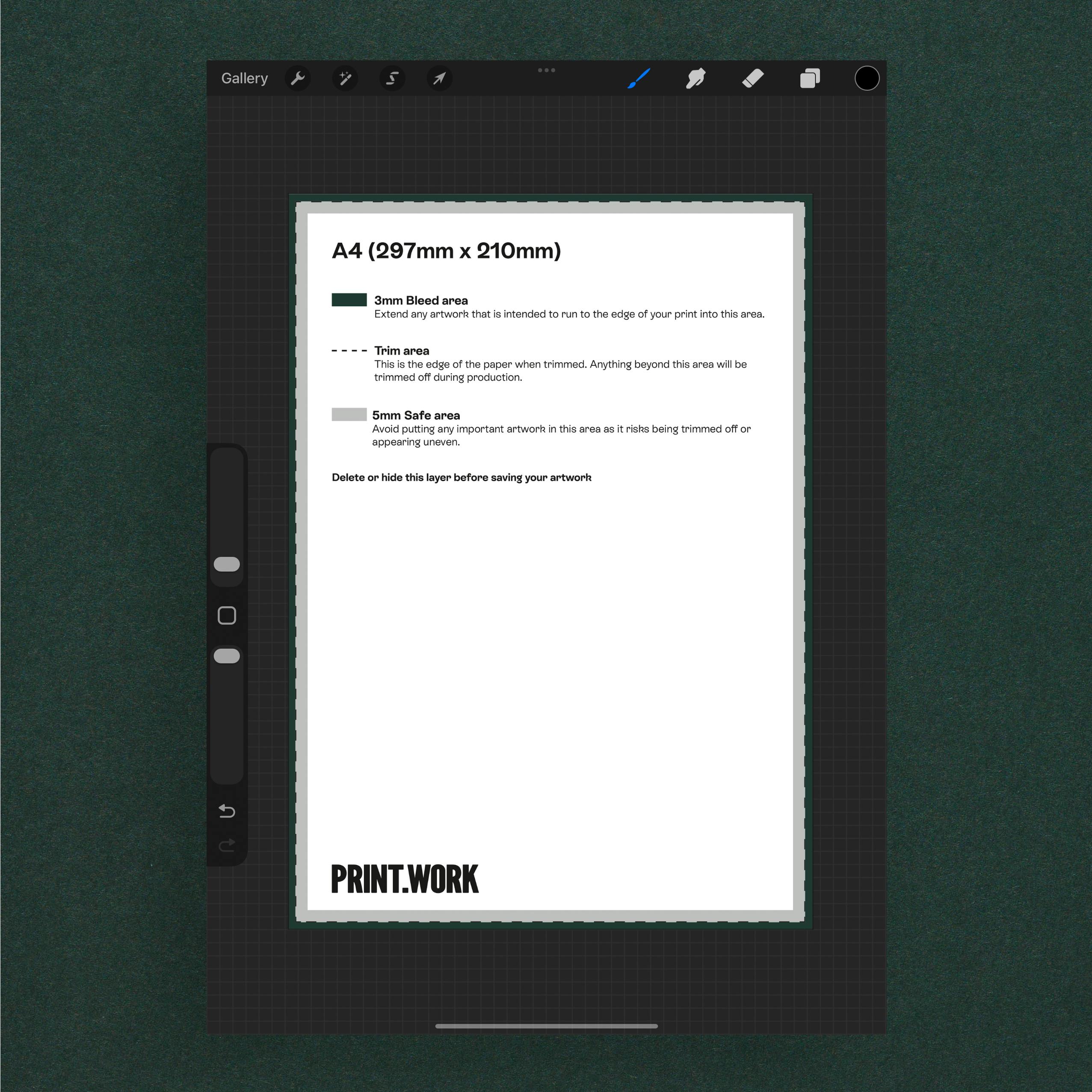 As mentioned above, Procreate doesn’t contain some of the print-specific design features that other programs do, so previewing print margins and safe areas can take a bit of creativity.