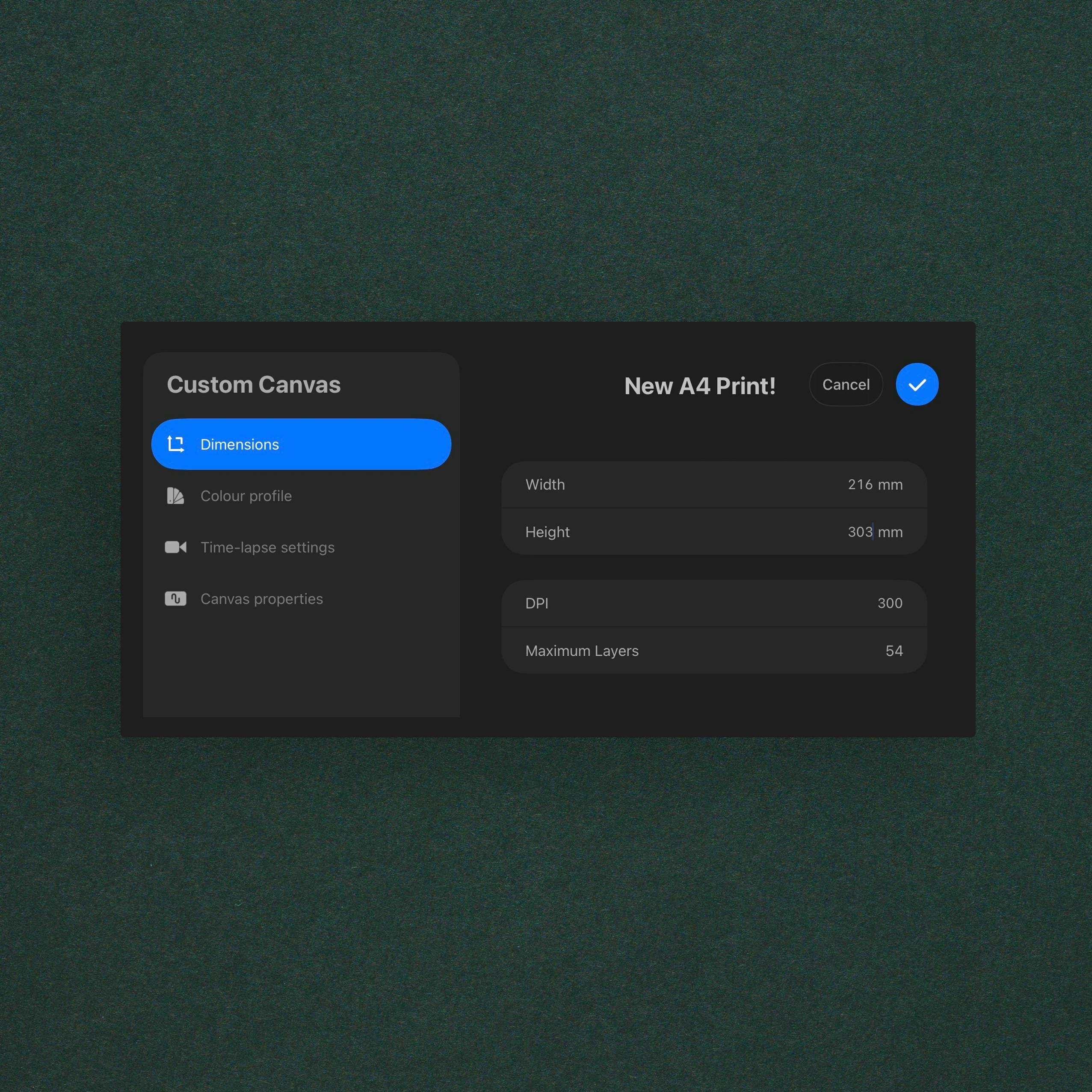 For the dimensions, we recommend selecting this in millimeters, and working at the exact size you wish to get printed. Because Procreate does not have automatic bleed settings, you will also need to add this manually, 3mm on each side of the print space.