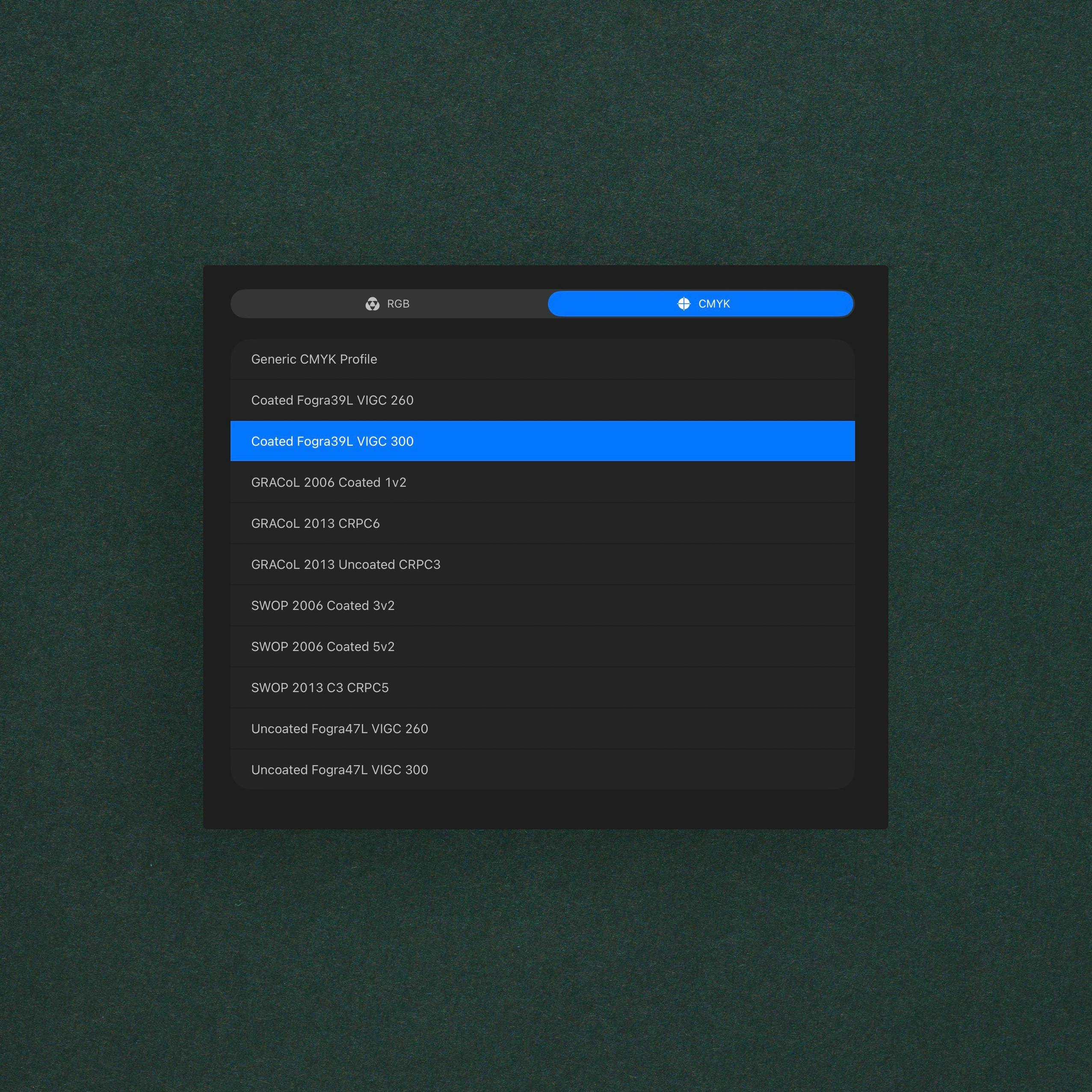 Another important consideration when creating a print file is the colour profile. You can select CMYK FOGRA39 from the colour profile drop down menu, which is the exact profile our printers use, and as such will give you the most accurate representation of how the printed colours should look.