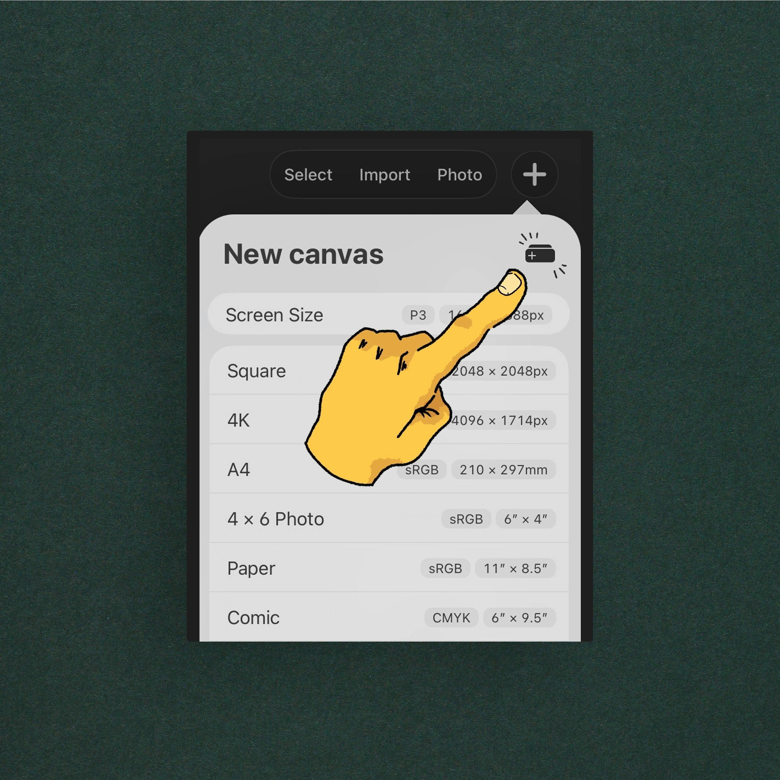 When making your print file in Procreate, it is important to check the size, resolution, and colour profile are correct from the start, as it can be tricky to change some of these settings afterwards. Many of the default canvas suggestions shown are not automatically well suited for printing, so it’s often best to select the ‘Custom’ option in the top right corner (indicated by the “+” sign).