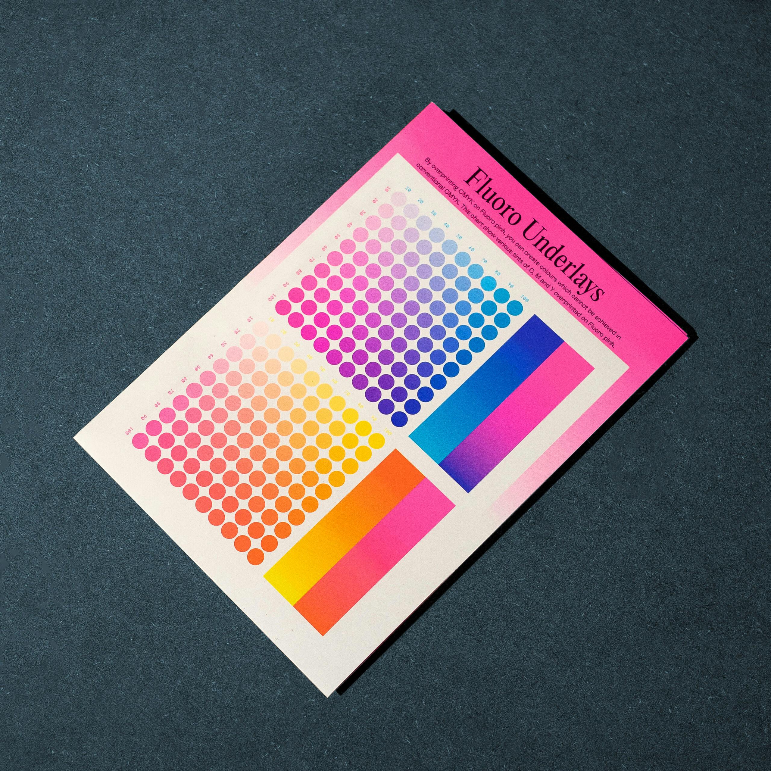 The pack contains a colour chart with various overprints that we feel work well with Fluoro Pink, allowing you to create vivid oranges or purples which cannot be achieved in conventional CMYK. When overprinting CMYK over Fluoro Pink, we would advise referring to the crossfold colour chart in our sample pack to give you an idea of various CMYK makeups which work well.